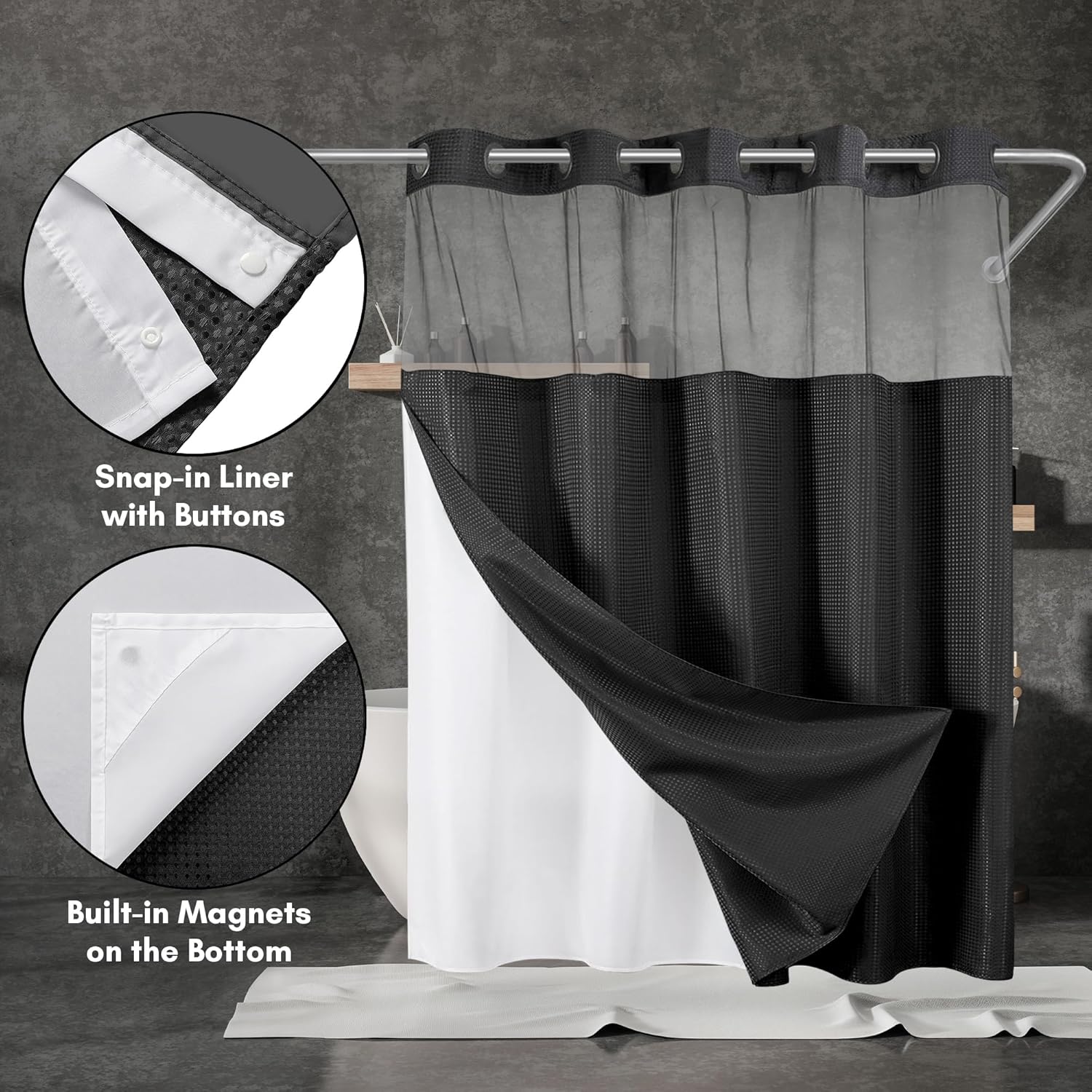 | Additional Features | Mildew Resistant, Mold Resistant, No Hook, Snap in Liner, Water Resistant |