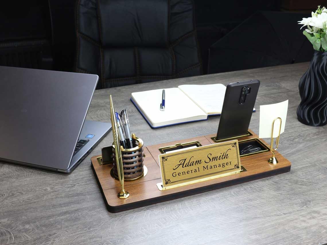Desk-top wooden card holder, pen holder, phone stand organiser set for the office. *The parts of the product can be joined together with a magnet.* Gold colored pen, business card holder, phone stand, pen holder offers a stylish and simple look and is extremely useful. It offers a very elegant appearance with its wooden patterned top layer. Size 15.3x7.5 inches Weight 1000 gr. Please open and check the cargo package before the courier staff leaves. In case of any damage, have the courier take action.