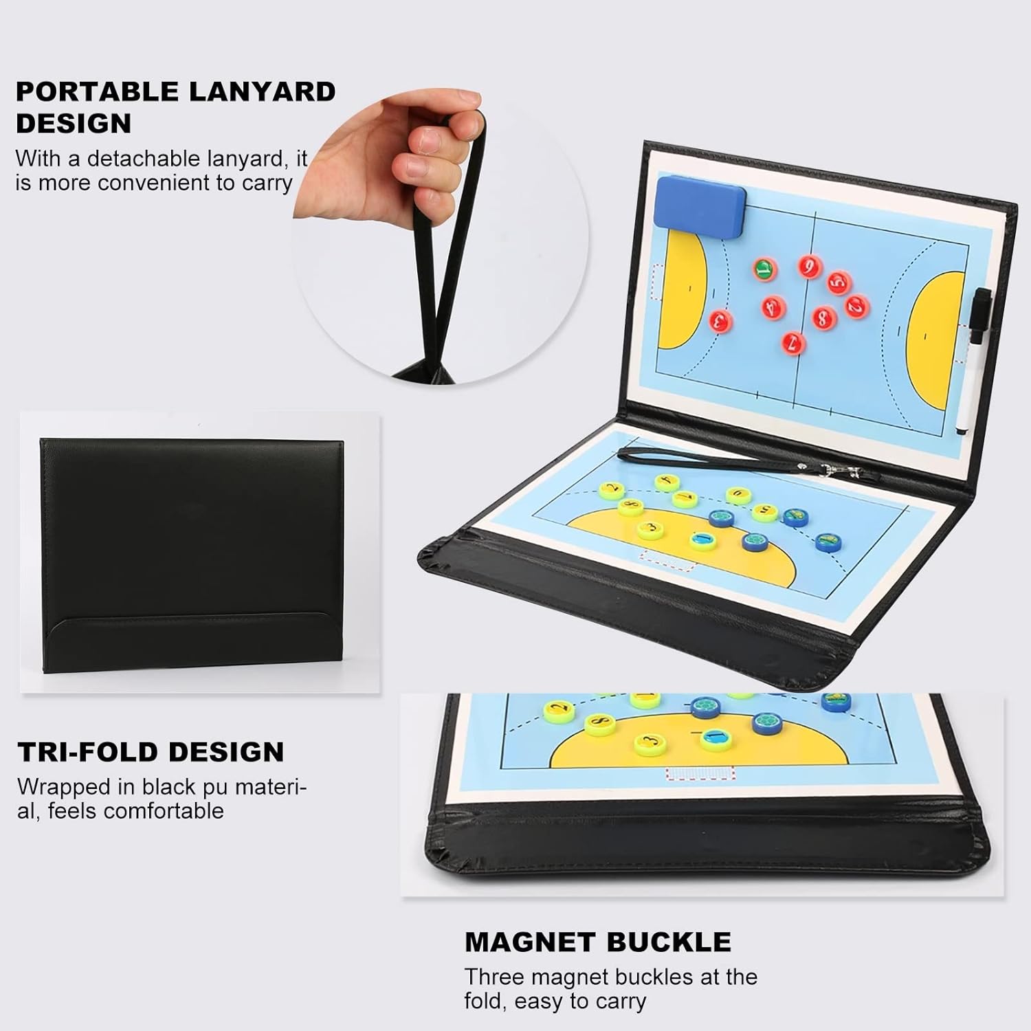 Handball coach board is an indispensable coaching tool for teams of all ages. Having a comprehensive game strategy is critical for optimal performance. This premium handball strategy clipboard is designed for every athlete and coach.Product Highlights:- Foldable and Portable Coach Tool, made from quality PU material in fine workmanship resistant to wear and durable,Perfect for all ages and lightweight for ease of use.- Comes with chess pieces to represent players and ball, for Help players quickly master strategy and come up with innovative set-piece routines.- Provided pen, eraser and all chess pieces are magnetic, firmly attached to board to prevent losing- Dry erase marker, easy to clean, you can easily mark strategies with your teammates.Specification:- Material: pu + magnets- Unfold size: 12.6 x 21.7 inches (32 x 55cm)- Fold size: 12.6 x 9.6 inches (32 x 24.5cm)Box contents:1 x Handball Coach Board1 x Water-Based Dry Erase Marker Pen1 x Eraser1 x set of Magnetic Chess Pieces►Note:1. We are manually measuring, there may be an error of 1-3cm, please prevail in kind.2. If you have any questions, you can contact us by email, we will reply you within 12 hours.