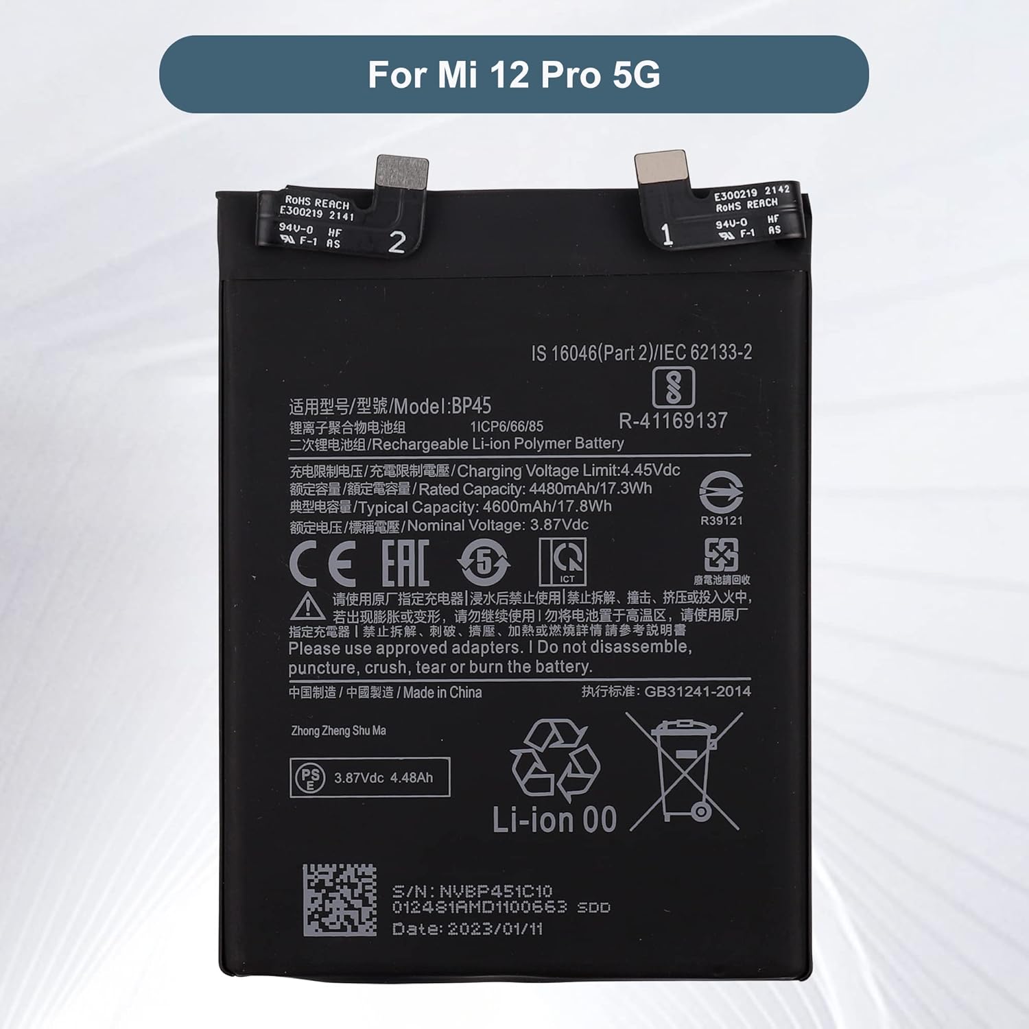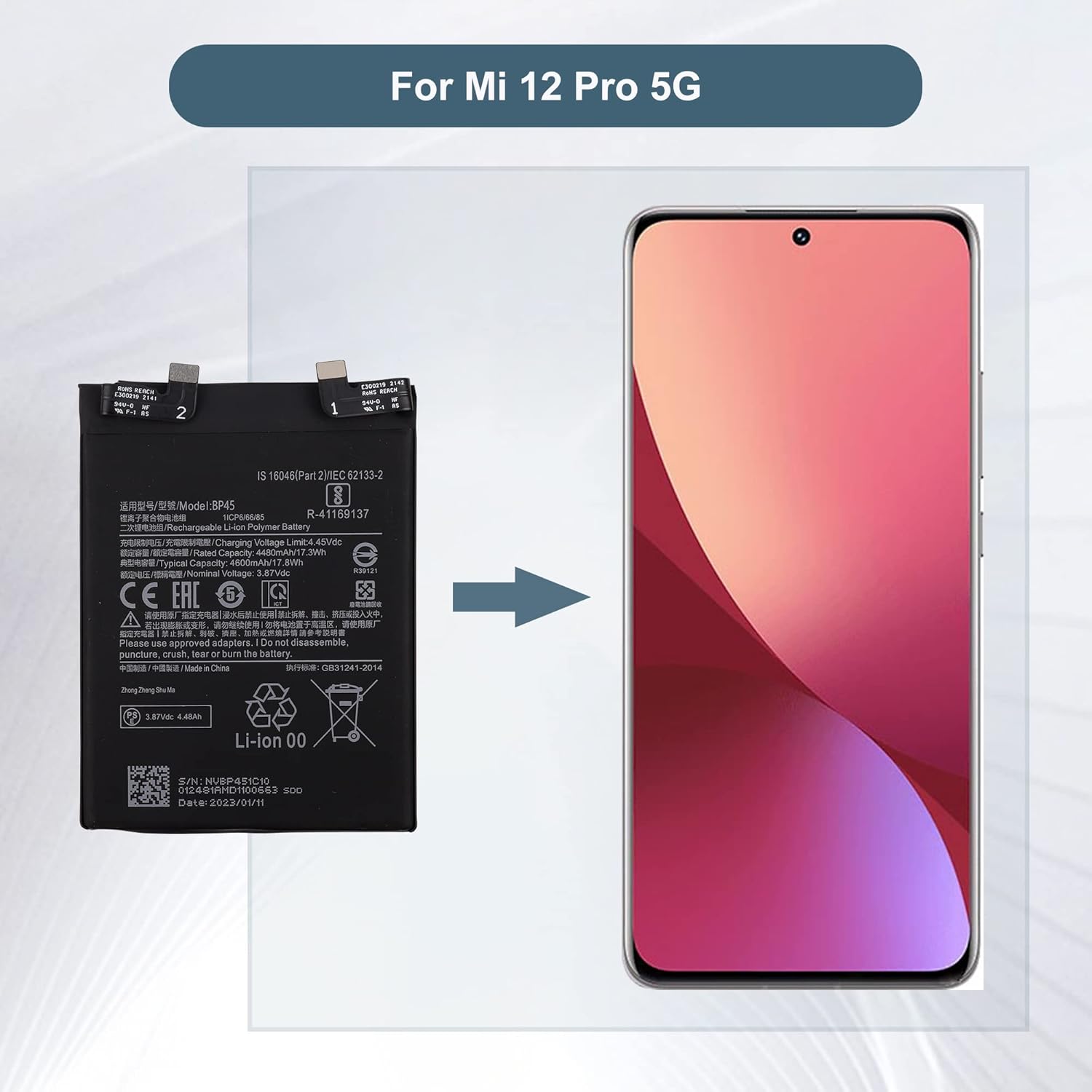 Item specsPart No:BP45Capacity:4600mAh/17.8WhVoltage:3.87VType:PolymerPackaging: 1 x battery,1x toolsCompatible withXiaomi 12 ProNotice before purchase1. Be carefully check the model number of your device to see if this battery is compatible with your device.2. A new Li-ion battery will achieve its best performance after 2 or 3 complete cycles of charge & discharge.3. When you install it, be sure the connector has been properly connected to your device.4. Do not use low quality third-party adapter charger to charge your device, that will shorten the battery's life.Contact usIf you have any questions or any issues when using our product, please send us a message, we will answer you within 24 hrs. Thank you for your time.