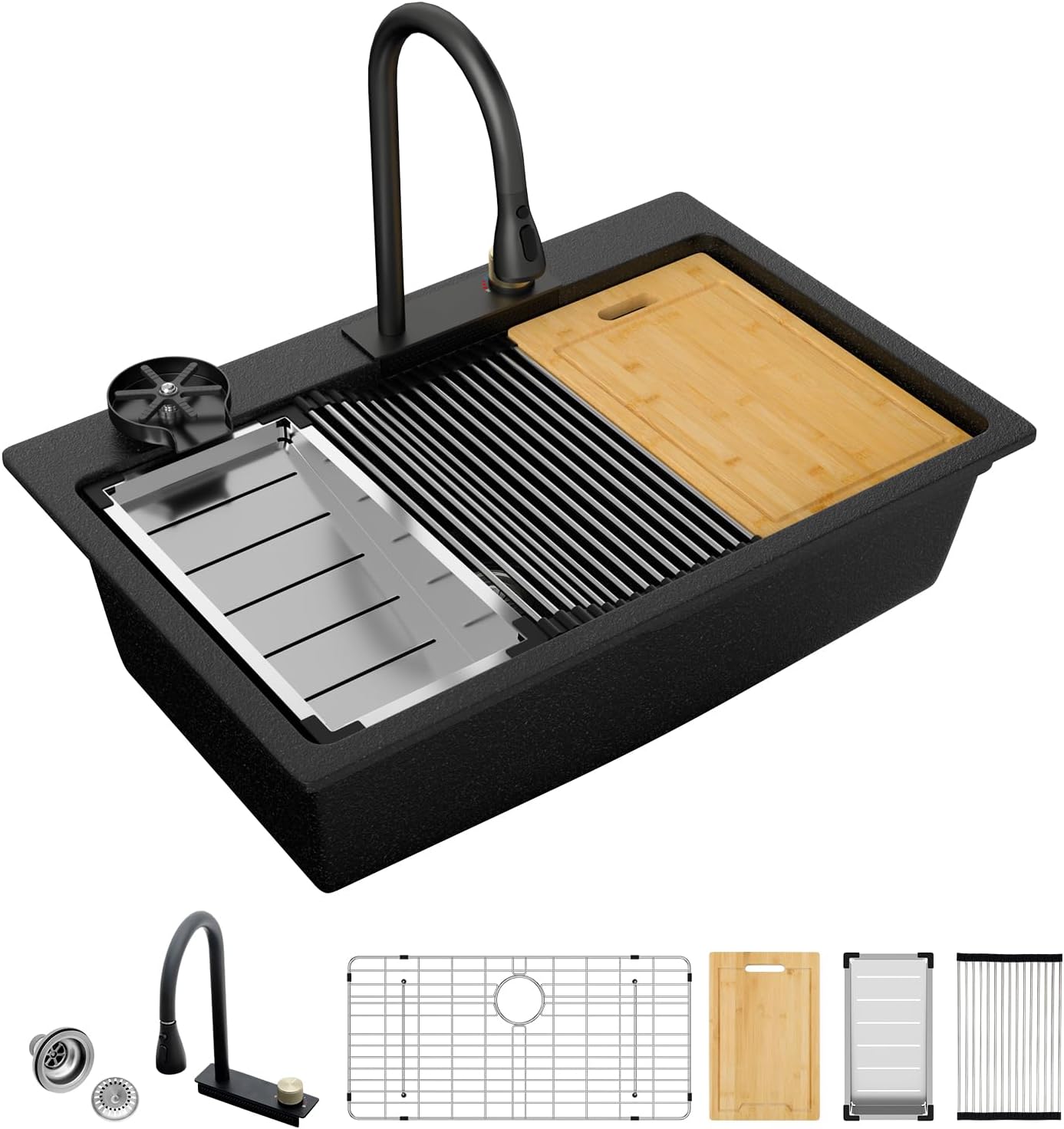 | Included Components | cup rinser+faucet, cutting board, drain strainler, roll up drying rack+bottom grid, waterfall kitchens sink |