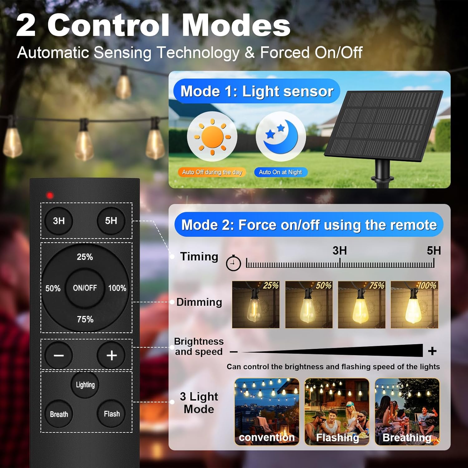 | Included Components | Outdoor string lights, Solar Panel, Zipper, remote |
