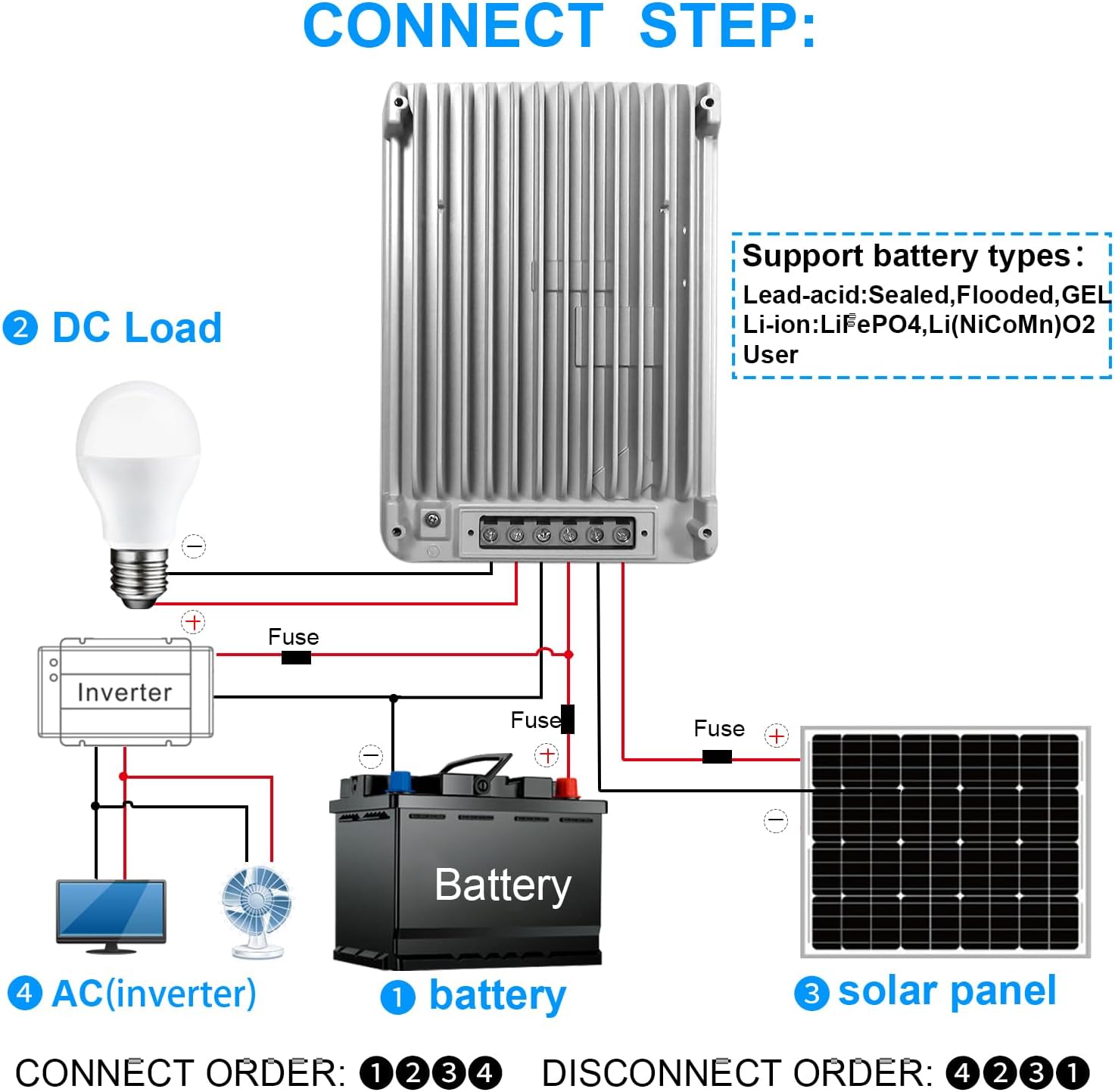 GCSOAR MPPT Solar Charge Controller 60A 12V/24V Auto Work Max 100V PV Solar Panel Charger Common Positive Grounding, Auto control system to limit the charging power & current under the rated value ★Max Input Current: 60 amp: Max Input Solar Power: 780W/12V 1560W/24V; Real-time energy recording and statistical. ★Support Sealed(SEL), Gel(GEL), Flooded(FLD), User-defined(USE) batteries and Lithium(Lit) Batteries too, Battery temperature compensation function to ensure the battery’s life. ★RS-485 communication bus interface and Modbus communication protocol, available to meet various communication requirements in different situations. ★MPPT Solar controller 60A with Dual RS485 communication, suppoprt parallel two/three or more controller to make 120A/180A system. Technical Data: Nominal system voltage:12V/24V DC auto identify Rated charging current :60A Rate discharging/Load current:30A Battery Type: Lead-acid(sealed/Flooded/Gel) and Lithium(LiFePO4, Li-NiCoMn) and User. Dual RS485 communication, suppoprt parallel two/three or more controller to make 120A/180A system. Max. PV open circuit voltage:100V MPPT technology tracking efficiency>=99.5%, conversion efficiency>98% Max. PV input power: 780W/12V, 1560W/24V Recommended Max cable: 28mm2 Operating ambient temperature: -20°C -- +50°C Dimension:245*170*63.5mm weight :2.35 KG Package List: 1 X MPPT Solar Charge Controller 60A 1 xTemp sensor cable 1 x Setting Instructions(English) 1X Manual (English)