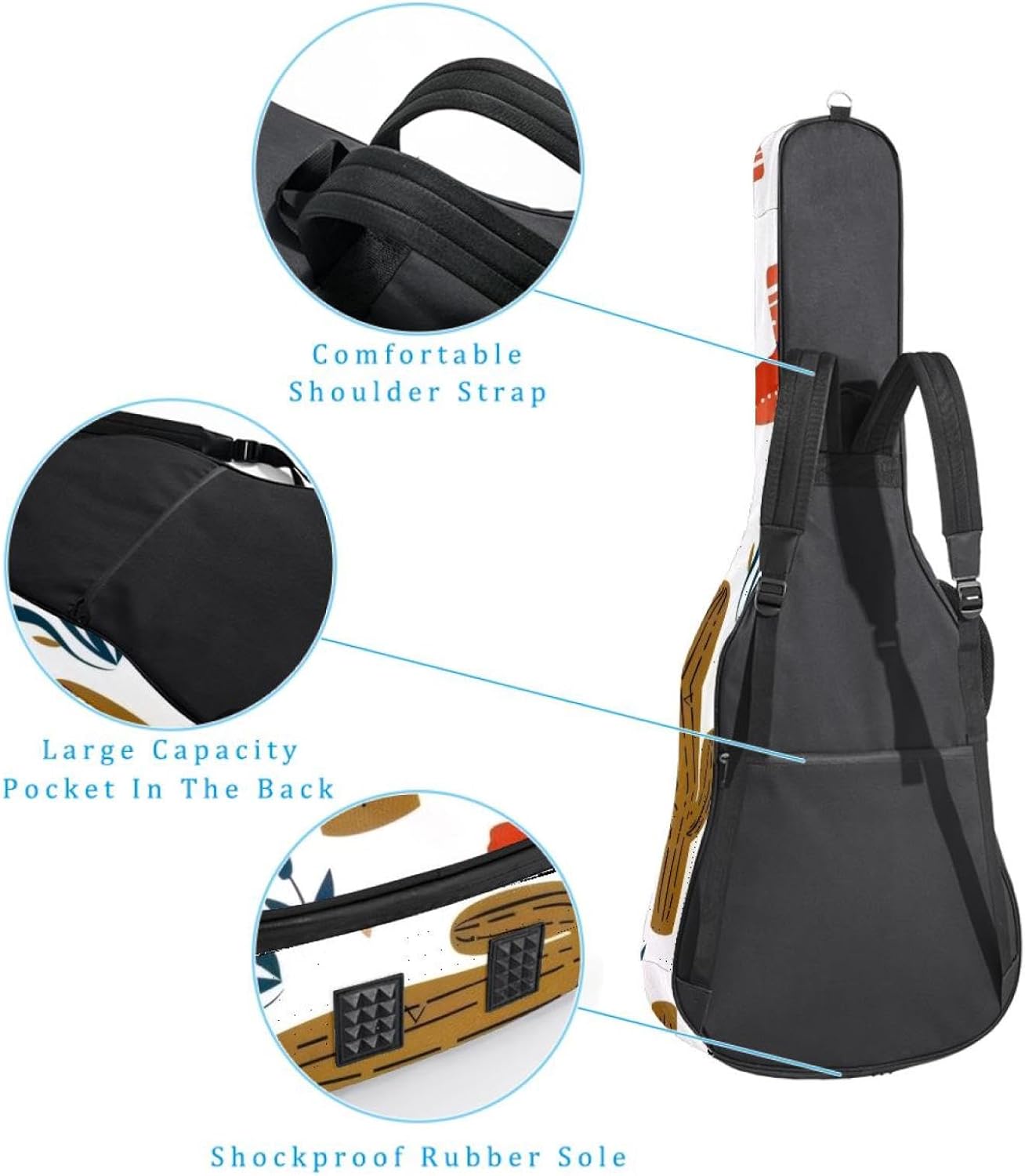 Specifications:Material: waterproof Oxford and waterproof zipper;Size: 42.9’’ x 16.9’’ x 4.7’’, perfect for 40'' 41'' 42'' guitar;Weight:36oz/1020g, lightweight;Color: Multi-color.Features:1. Adjustable backpack shoulder straps and padded side carry handle for more pleasant carrying choices.2. 10mm thick sponge padding inside provide protection for your musical instrument; and fixed Velcro above neck and body keep your acoustic guitar bag safer.3. This guitar bag comes with back hanger loop can be hung on the wall. Save more space when not in use.4. Two pockets for storage convenience, 1 large capacity pocket on outside back and 1 small pocket on the inside neck.5. Cute printed guitar gig bag guitar case backpack, ideal as a gift for your relatives or friends who love music when birthday, Thanksgiving, Christmas, holidays, and other special events.