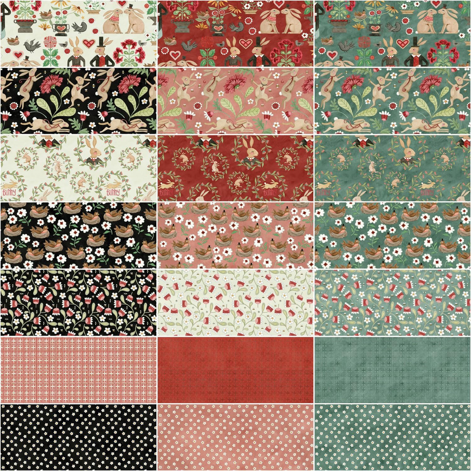 Fabric bundle of 42 10-inch squares from the Hop Hop Hooray collection by designer Teresa Kogut for Riley Blake Designs. Spring is here with Teresa Kogut's designer fabric collection, Hop Hop Horray! Teresa's beautiful watercolor folk art features an array of bunnies and their friends celebrating the arrival of spring. The coordinating prints blossom with happy wreaths, blooms and bees, daisies, and the most dapper little robin. Let your imagination take flight and create quilts and home decor projects with this striking color palette of flax, coral, teal, and black.