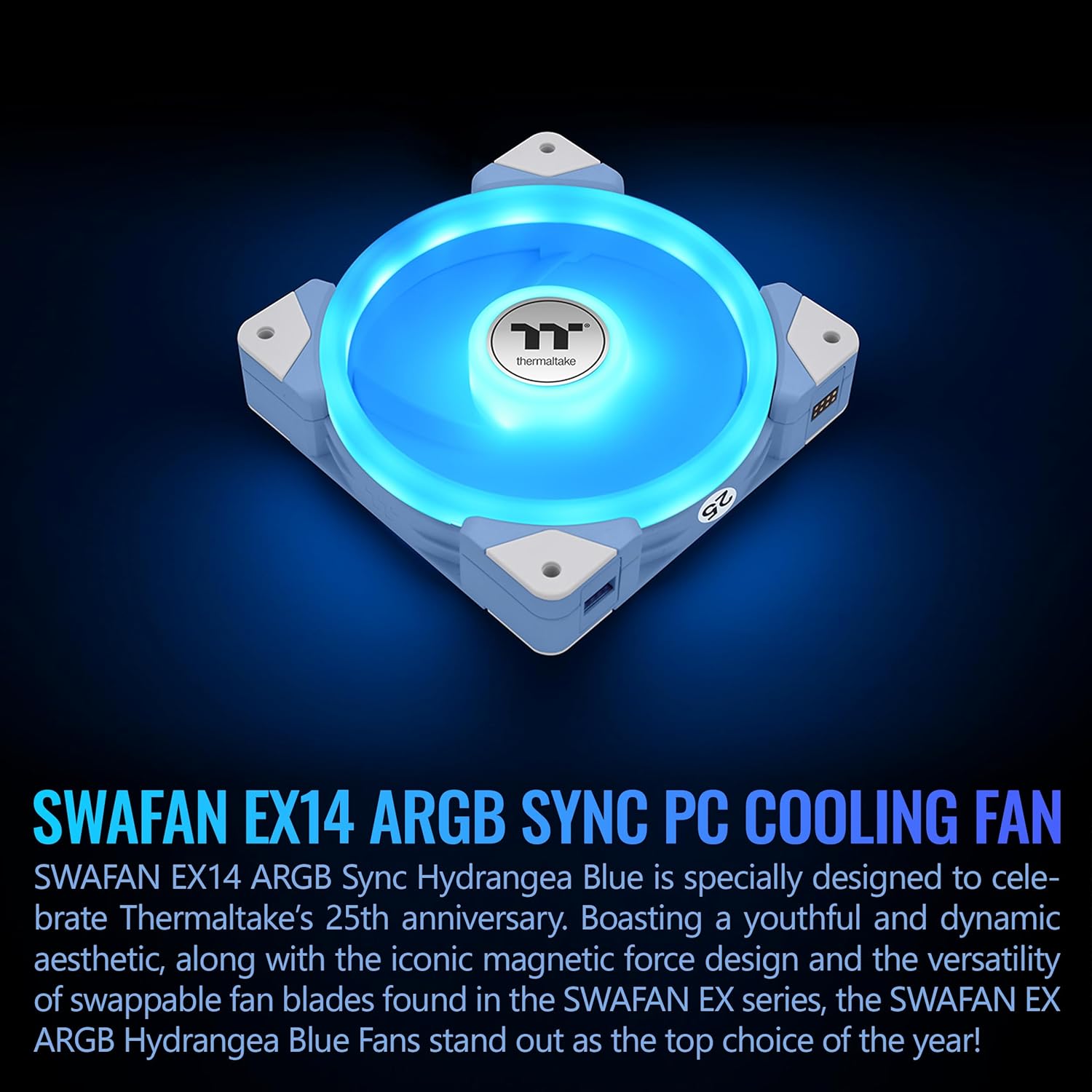 SWAFAN EX14 ARGB brings magnetic force design to ARGB fans while keeping the iconic swappable fan blade design. Daisy-chaining up to 3 fans per cable improves fan connection efficiency and convenience while enhancing cable management for PC building. This design keeps the assembly process simple while reducing installation time, making this fan more user-friendly and bringing extra fun while building your PC. Besides, it opens the door for you to have control over its lighting effects by 5V motherboard-controlled software. •P/N: CL-F184-PL14BU-A •DIMENSION: 140 x 140 x 25 mm •INTERFACE: 2510-4 PIN PWM •FAN STARTED VOLTAGE: 9.0 V •FAN RATED VOLTAGE: 12 V & 5V •RATED VOLTAGE: 12 V - 0.32 A •POWER INPUT: 12 V – 3.84 W •FAN SPEED: PWM 500 ~ 2000 R.P.M •MAX AIR PRESSURE: Standard Fan Blade : 3.17 mm-H2O (one fan) ; Reverse Fan Blade: 2.73 mm-H2O (one fan) •MAX AIR FLOW: Standard Fan Blade : 81.6 CFM (one fan) ; Reverse Fan Blade : 79.3 CFM (one fan) •NOISE: Standard Fan Blade : 34.5 dB-A (one fan) ; Reverse Fan Blade : 38.8 dB-A (one fan) •BEARING TYPE: Hydraulic Bearing •LIFE EXPECTATION: 40,000 hrs,25℃ •OTHER: Fan Frames x 3 ; Standard Fan Blade x 3 (Pre-installed) ; Reverse Fan Blade x 3 ; Cable x 3