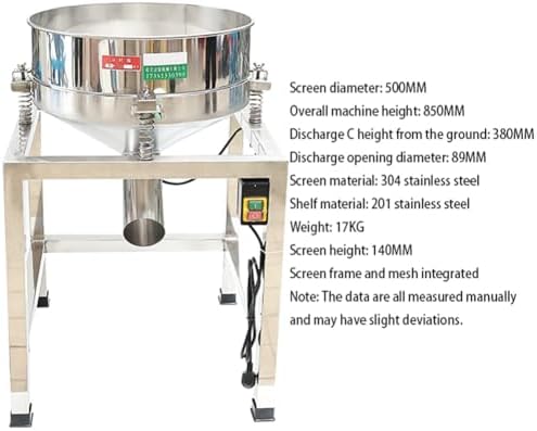 Vibrating Sieve Shaker Machine, Electric Stainless Steel Flour Sifter with 40 & 100 Mesh for Industrial Baking Powder Use Introducing the Automatic Commercial Vibrating Sifter Machine, expertly engineered for industrial applications. This efficient electric flour sifter features a sturdy stainless steel construction with a sleek silver finish. With a screen diameter of 500MM and an overall height of 850MM, it has a convenient discharge height of 380MM and a discharge opening diameter of 89MM. The machine is built with high-quality 304 stainless steel for the screen material, while the frame is composed of durable 201 stainless steel, ensuring long-lasting performance. Weighing 17KG, it strikes a balance between sturdiness and portability, making it adaptable for various settings. The screen height is 140MM, and its integrated screen frame and mesh design enable straightforward operation. Please be aware that all dimensions are measured manually and may have slight deviations. Package includes: 1 Automatic Commercial Vibrating Sifter Machine 1 40 Mesh screen 1 100 Mesh screen Important